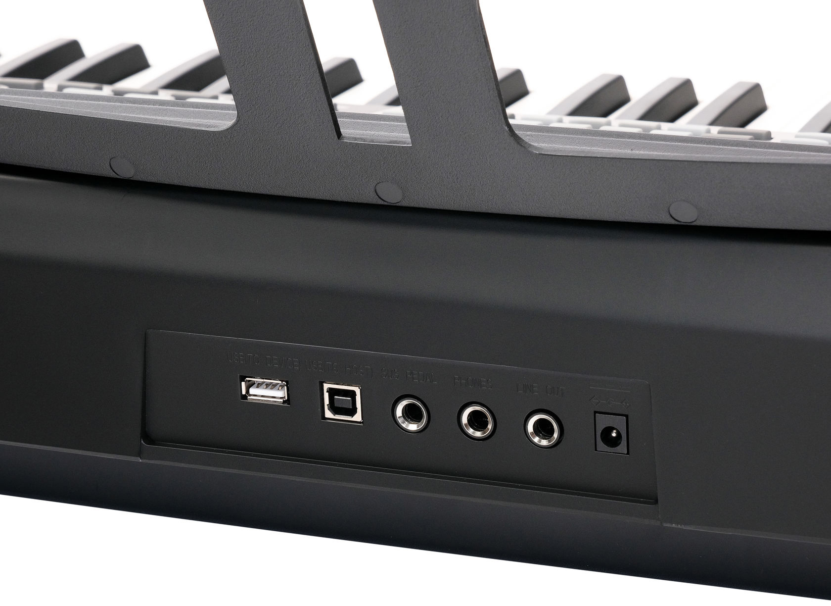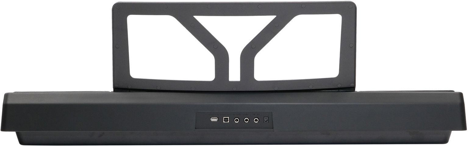 - разъемы подключения внешних устройств: вход питания, линейный выход, выход подключения наушников, гнездо подключения педали сустейн, разъем USB MIDI, разъем USB (MP3).