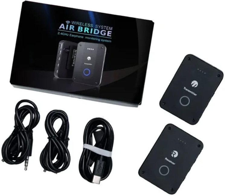 - аксессуары в комплекте: передатчик x1, приёмник, USB-кабель для зарядки x1, аудиокабель x2